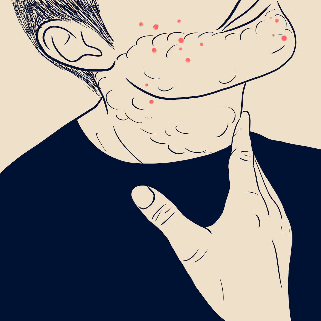 Si vous souffrez d'éruptions cutanées rouges après le rasage, sachez qu'il ne s'agit certainement pas d'acné, mais plutôt de boutons de rasoir, c'est-à-dire de poils incarnés. Celles-ci se produisent lorsque les pointes acérées des poils fraîchement rasés s'enroulent et repoussent dans la peau. La meilleure façon d'éviter cela est d'exfolier avant le rasage et de toujours se raser dans le sens du grain : lorsque vous vous rasez à contre-courant, les poils sont coupés si courts qu'il est beaucoup plus facile pour eux de s'incruster dans la peau.