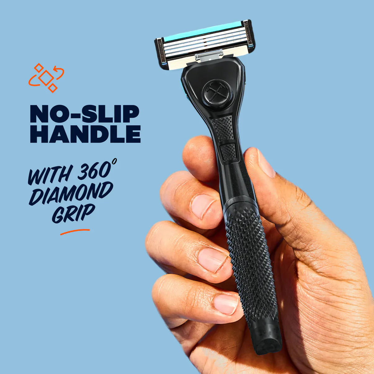 Chaque lame a besoin de son manche. Que vous optiez pour notre lame Club Series 4 ou 6 Lames les deux types de lames sont compatibles avec cette poignée lourde à motif en losange, conçue pour un confort et un contrôle ultimes. L'époque où l'on tenait un rasoir à ras et croisait les doigts pour que tout se passe bien est révolue.